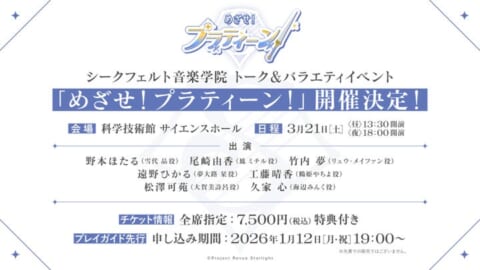 ゲームアプリ「スタリラ」から登場したシークフェルト音楽学院のトーク&バラエティイベント「めざせ!プラティーン!」の開催が決定しました。本イベントでは、シークフェルト音楽学院のエーデルより5名、中等部より2名が出演し、歌とトークを交えたバラエティ豊かなステージを届けます。チケットのプレイガイド先行抽選申込は、2026年1月12日19時より開始します。