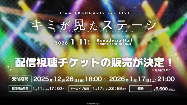 2026年1月11日(日)にKanadevia Hall(旧TOKYO DOME CITY HALL)にて開催された「from ARGONAVIS 3rd LIVE – キミが見たステージ –」の開催報告が公開されました。無期限活動休止を発表した本プロジェクトの活動休止前ラストとなる合同ライブは全チケットがSOLD OUTし、全35曲を披露。国内外での配信も実施しています。