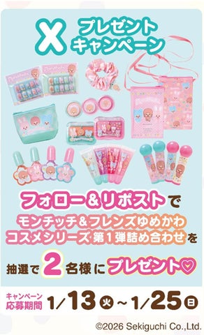 プライズ用景品の展開を記念して、モーリーファンタジー公式X(旧Twitter)およびInstagramでは、「モンチッチ&フレンズゆめかわコスメシリーズ第1弾詰め合わせ」が抽選で各2名に当たるSNSキャンペーンを開催します。