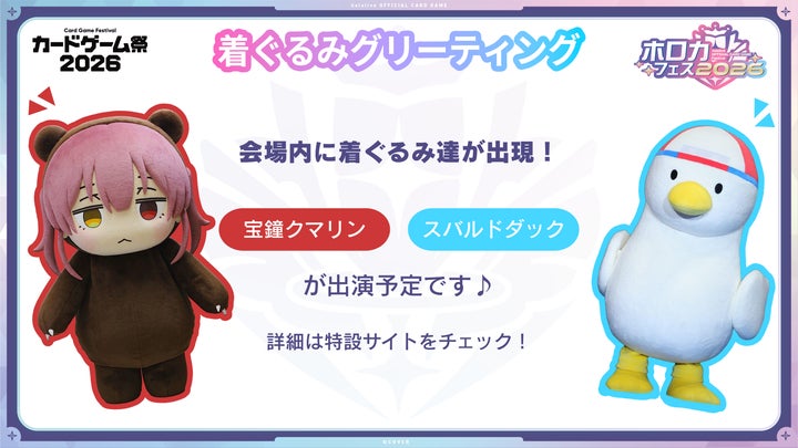 また、イベント当日の対戦エリアでは、ホロライブの着ぐるみ「宝鐘クマリン」と「スバルドダック」が登場し、来場者とのグリーティングを行います。グリーティングスケジュールは後日公開予定です。