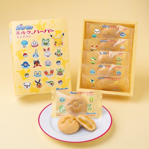 『ポケモンミルクハーバーモンブラン』は、練乳とはちみつを使用したしっとりとした生地で、栗ペーストを練り込んだモンブラン餡を包みました。やさしく香る栗の風味にこだわり、洋菓子のモンブランを焼き上げたイメージのひとくちサイズです。商品本体はモンスターボールをモチーフにした形に仕上げています。
