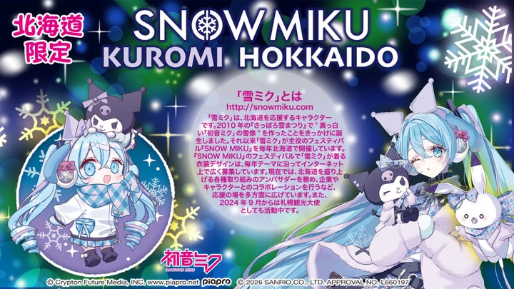 北海道を応援するキャラクター「雪ミク」とサンリオの大人気キャラクター「クロミ」がコラボレーションした北海道限定『SNOW MIKU×KUROMI HOKKAIDO』新デザインアイテムが、2026年1月より順次発売されます(一部商品発売中)。冬の北海道をテーマに昼と夜の世界観を描いた特別なグッズの概要や購入方法を詳しくご紹介します。