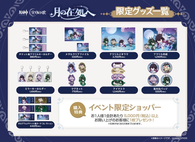 本イベント開催を記念した限定グッズを販売します。特設会場には、イベント限定のオリジナル装飾も施されており、『原神』の世界観を存分に体験できる空間です。