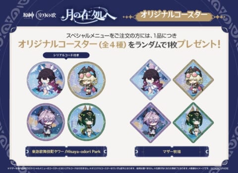 東急歌舞伎町タワーの店舗で提供されるメニューに付くコースターには、「原石50個」を含むゲーム内アイテムと交換できるシリアルコードが記載されています。