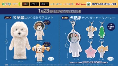 SNSで人気の『犬記録』の限定プライズゲーム用景品とカプセルトイが、2026年1月23日よりモーリーファンタジーなど全国のアミューズメント施設とモーリーオンラインに登場します。