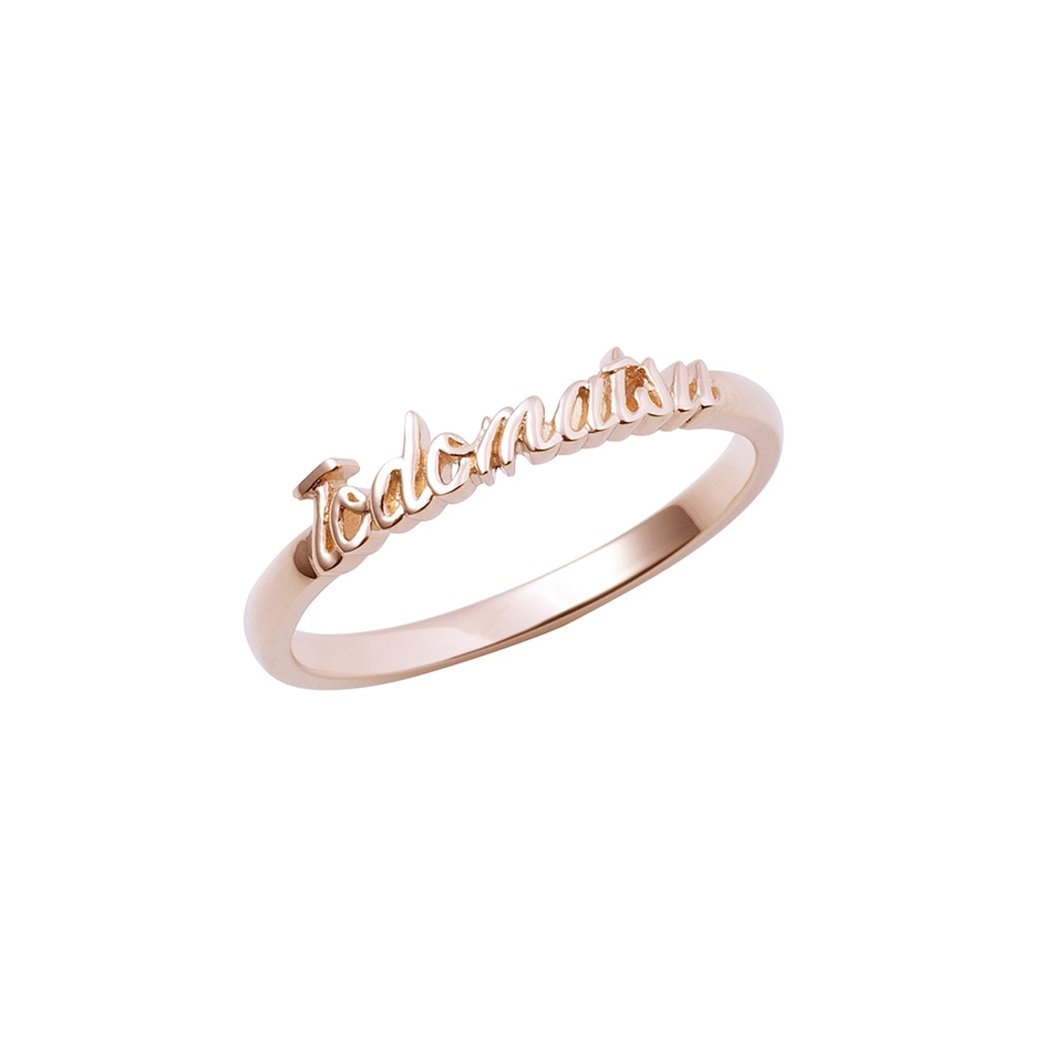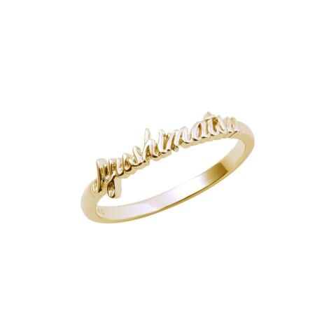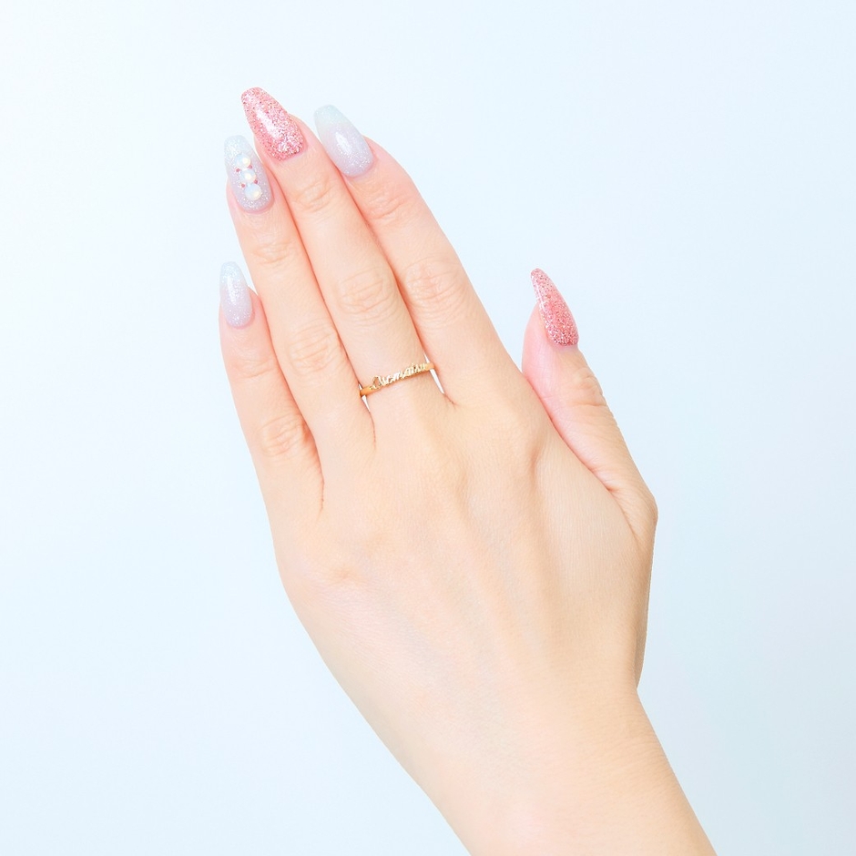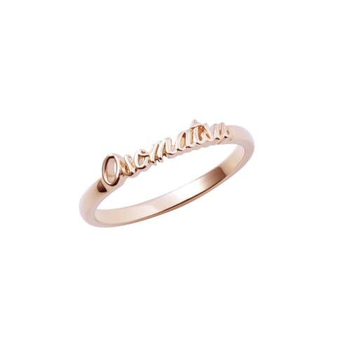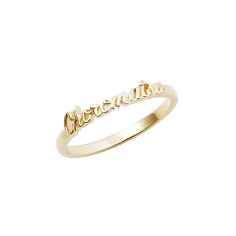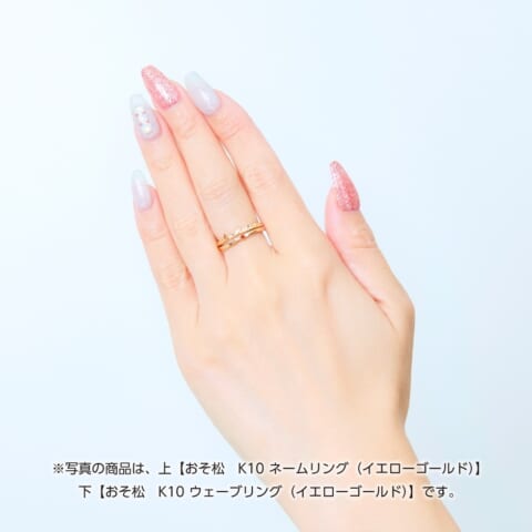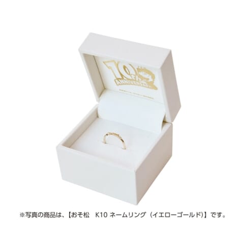 TVアニメ「おそ松さん」10周年を記念したK10ネームリングは、6つ子の名前をスタイリッシュなデザインで表現したゴールドリングです。ピンク、イエロー、ホワイトの3色から選べるゴールドカラーで、お手持ちのアクセサリーやファッションコーディネートに合わせて楽しめます。細身で洗練されたデザインは、K10ウェーブリングとの重ね付けにも最適です。