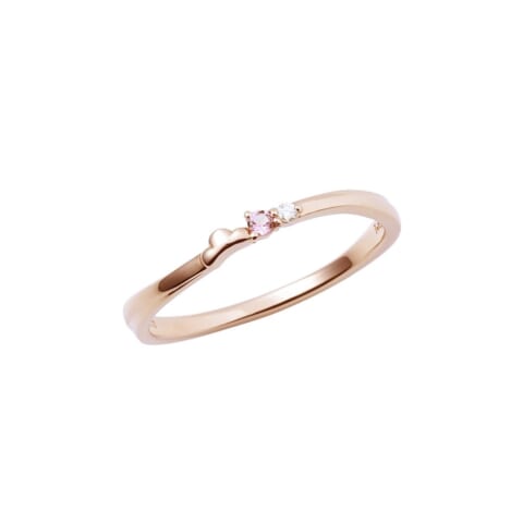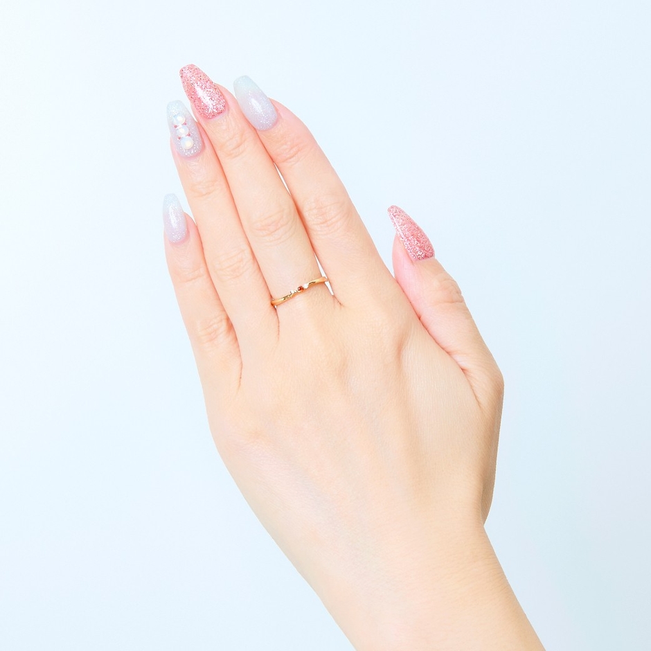 同じくTVアニメ「おそ松さん」10周年を記念したK10ウェーブリングは、細身のウェーブデザインが特徴です。松モチーフと、各キャラクターのイメージカラーに合わせた天然石、そしてモアサナイト(合成石)が美しく配置されています。リングの内側には、名前の刻印が施されており、特別感を一層高めます。こちらもゴールドのカラーを3色から選択でき、K10ネームリングとの重ね付けもおすすめです。