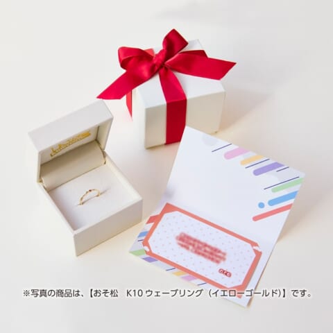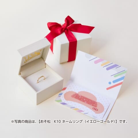 本K10ジュエリーには、すべてオリジナルBOXと書き下ろしメッセージ入りカードが付属します。外箱のリボンカラーはキャラクターによって異なり、コレクションとしても楽しめます。さらに、ネームリングとウェーブリングではメッセージの内容が異なるため、両方を手に入れることで、より深く「おそ松さん」の世界観を体験できるでしょう。