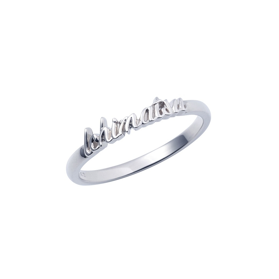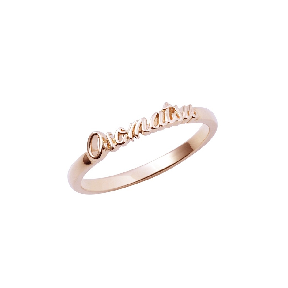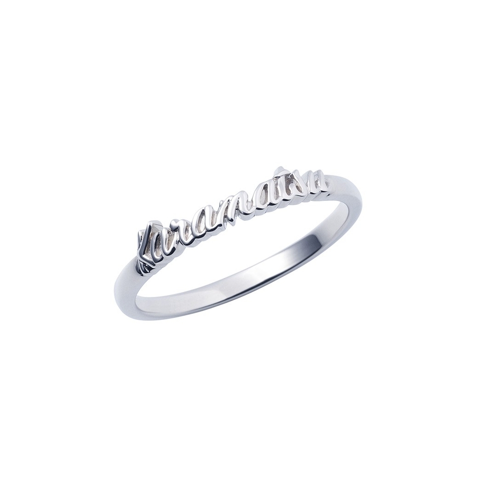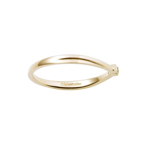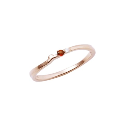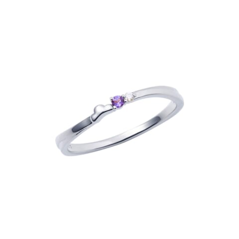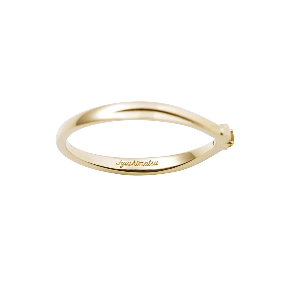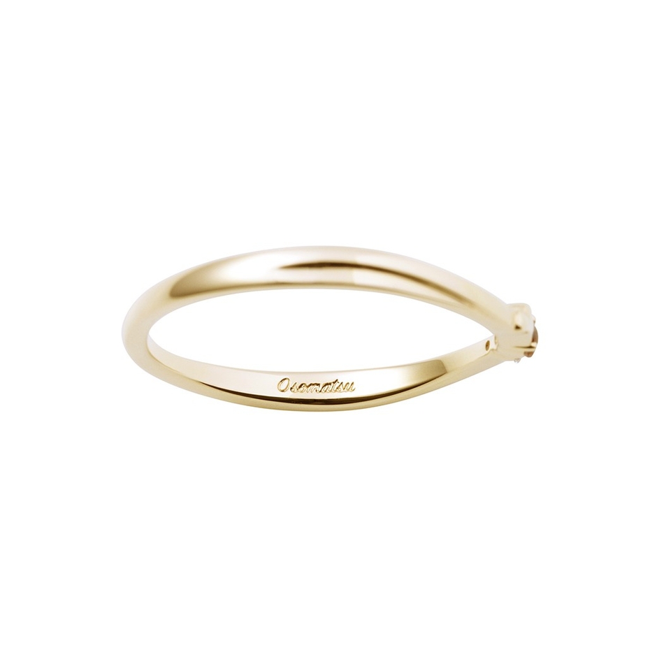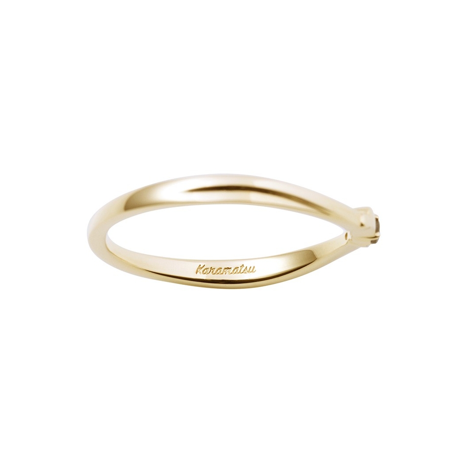 細身のウェーブタイプに松モチーフとイメージカラーの天然石(おそ松:ガーネット、カラ松:アイオライト、チョロ松:ペリドット、一松:アメジスト、十四松:シトリン、トド松:ピンクトルマリン)&モアサナイト(共通)をセット。内側には名前の刻印が施されています。 |
