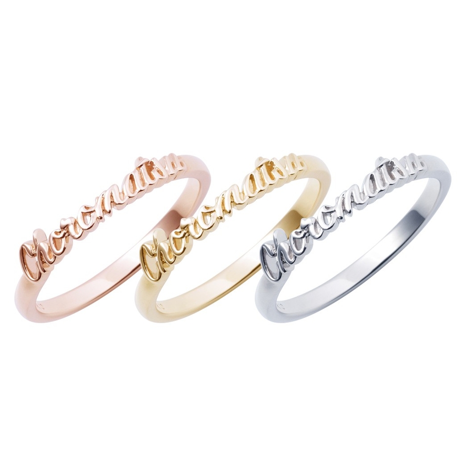 6つ子それぞれの名前をおしゃれなネームリングに仕立て、ゴールドのカラーはピンク/イエロー/ホワイトの3色から選択可能です。 |