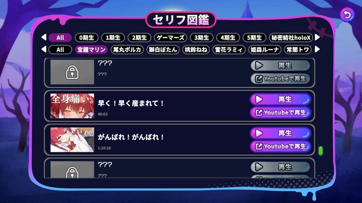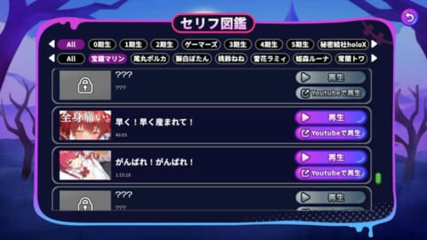 コンプリートを目指す「セリフコレクション」と元動画リンク機能