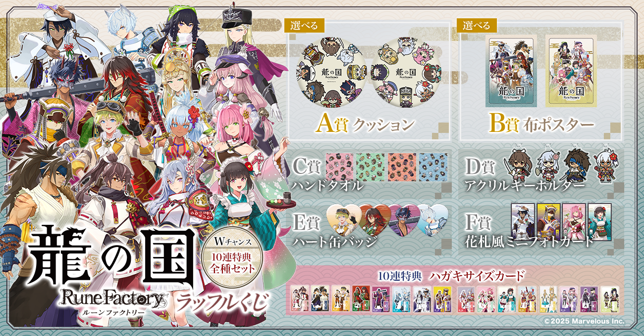 フォッグ株式会社は、オンラインくじサイト「RAFFLE」にて、『龍の国 ルーンファクトリー』の限定景品が登場するオンラインくじを発売します。公式キャラクター16名が勢揃いし、和の趣あふれる限定グッズを楽しめます。