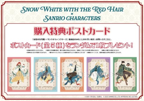 「赤髪の白雪姫×サンリオキャラクターズ」の新商品のみを対象に、1会計で2,200円(税込)以上お買い上げごとに、ポストカード(全5種)をランダムで1枚プレゼントします。店頭および通販サイトでの購入が対象です。