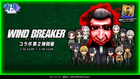 「青鬼オンライン」にて、TVアニメ『WIND BREAKER』との2回目となる大型コラボイベントが2026年1月16日より開催します。限定キャラクタースキンやオリジナルグッズが登場する、ファン必見のイベントです。
