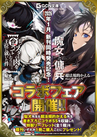 マイクロマガジン社は、GCN文庫の注目作『魔女と傭兵 7』と『モンスターの肉を食っていたら王位に就いた件 6』の同時発売を記念し、特典としてコラボSSリーフレットがもらえるフェアを2026年1月20日頃より開催します。