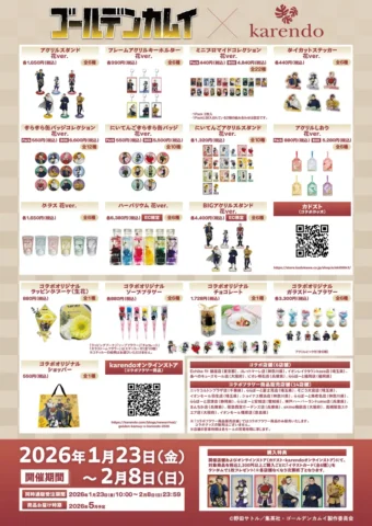 TVアニメ『ゴールデンカムイ』とフラワーショップ『karendo』のコラボレーションが2026年1月23日より開催。描き下ろしイラストを使用したオリジナルグッズやコラボフラワー商品を限定販売します。