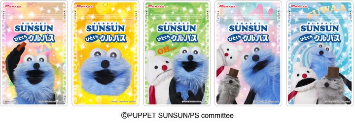 「パペットスンスン ひとくちカルパス」のパッケージは、主人公スンスンがカルパスを持つ姿をはじめ、スンスン、親友のノンノン、おじいちゃんのゾンゾンの組み合わせなど、全5種類のデザインで展開します。