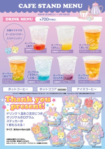 全国9店舗のカフェスタンドでは、池袋店と同様にキラキラドリンクカラーほっぺちゃん(全7種)を各700円(税込)で提供します。