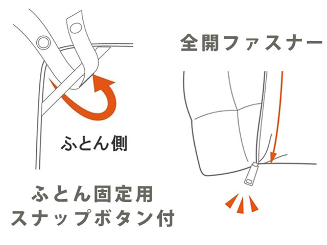 ふとん専門店ならではの工夫として、おふとんとカバーのズレを防ぐ紐にスナップボタンを採用しています。紐を結ぶ手間がなく、パチンと留めるだけで簡単に固定できます。