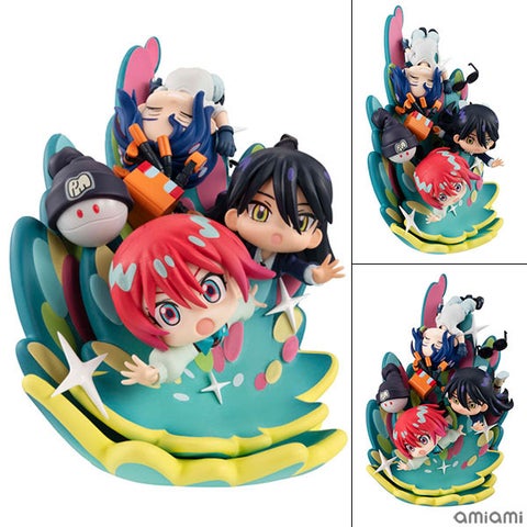 キラキラに飛び込んでいくシチュエーションをイメージし、アマテ・ユズリハ(マチュ)、ニャアン、シュウジ・イトウの3人が立体化されています。カラフルな台座からキャラクターが勢いよく今にも飛び出しそうな様子を再現したデザインです。