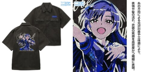 価格16,500円(税込)で提供されるこのワークシャツは、刺繍の名産地である群馬県桐生市で生産されています。“如月千早”を10万ステッチ以上の刺繍技術で精密に再現しました。着た時の満足感をプリントとは異なる刺繍で表現しています。胸元にはゴールドの糸を使用した織りネームを縫い付け、高級感を加えます。厚みとハリのあるマットな風合いの生地を使用し、型崩れしにくくタフな仕様です。ポリエステル混の丈夫な生地は摩擦に強く、シワになりにくい特長を持ちます。肩やポケットはダブルステッチで補強し、両胸にはボタン付きフラップポケットを配置しました。身幅にゆとりを持たせ、パーカーやロンTとの重ね着にも適しています。