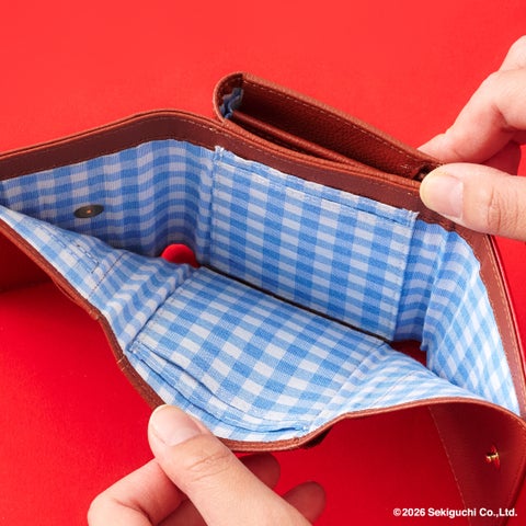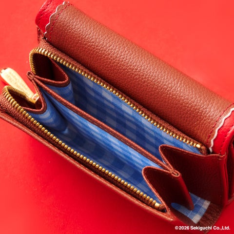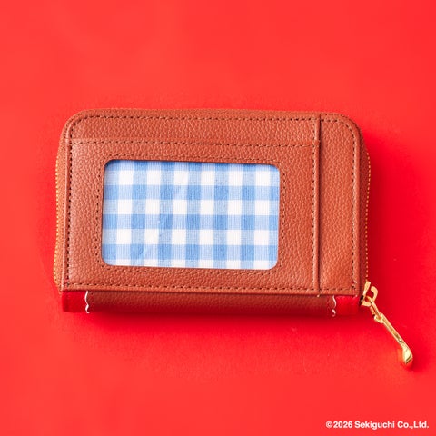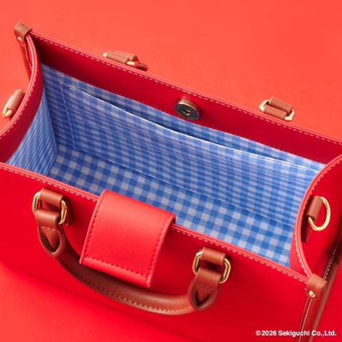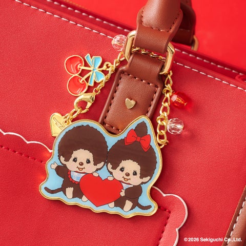 「モンチッチちゃん」をイメージしたブラウン×レッドの配色とスカラップのデザインがポイントです。フロントにはオリジナルのリボンとスタイをつけた「モンチッチちゃん」の金具を使用し、裏地にはギンガムチェックをデザインしています。
