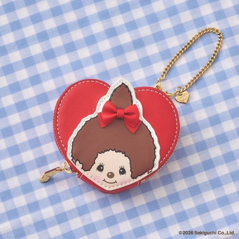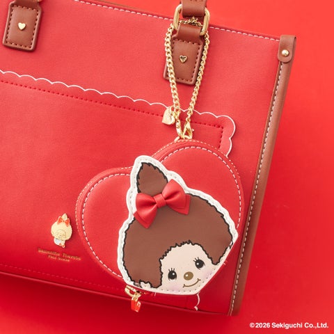 • 「モンチッチちゃん」の愛らしい顔をワッペン風にデザインしたハート型ポーチです。チェーンが付属するため、バッグに付けてコーディネートを楽しめます。ポーチの裏地はギンガムチェックデザインです。