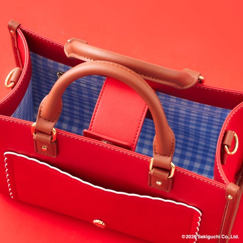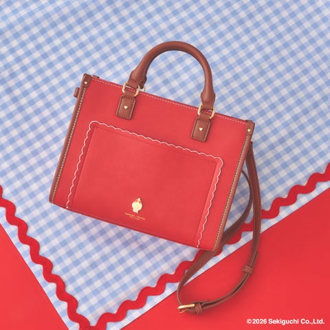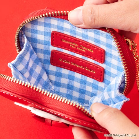 • チェリーをイメージしたレッドカラーをベースに、スカラップデザインや「モンチッチちゃん」のゴールド金具を施したデザインがポイントです。裏地にはギンガムチェック生地を使用しています。ショルダー付きで2Wayで使用でき、スナップボタンで簡単に開閉できます。フロント正面のスカラップデザインは小物が収納できるポケット付きです。