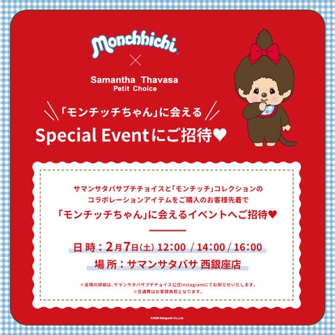 サマンサタバサプチチョイスと「モンチッチ」コレクションのコラボレーションアイテムを購入したお客様を、先着で「モンチッチちゃん」に会えるスペシャルイベントへ招待します。