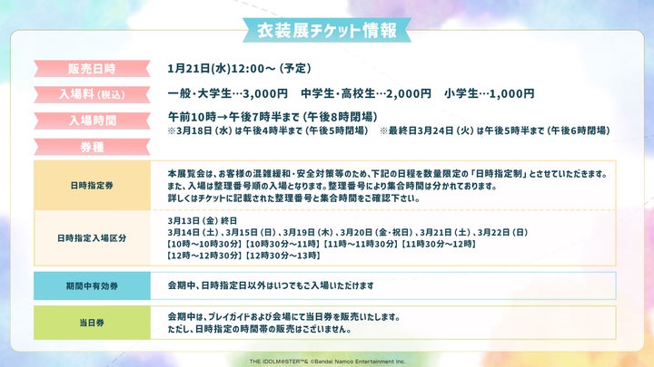 会期中、プレイガイドおよび会場で当日券を販売します。ただし、日時指定の時間帯には販売がありません。