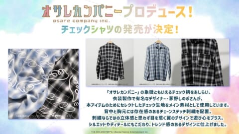 • 「オサレカンパニー」プロデュースチェックシャツ: 『アイドルマスター シャイニーカラーズ』のライブ衣装制作を担当するオサレカンパニーがプロデュースしたチェックシャツです。デザイナー茅野しのぶ氏がセレクトしたチェック生地を使用し、背中と胸元には翼のデザインを施したチェーンステッチ刺繍を配置しています。