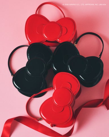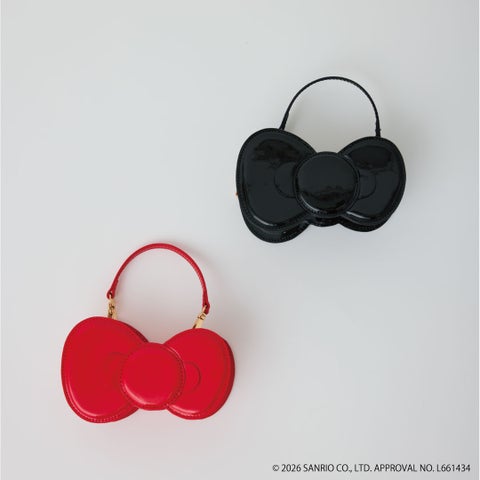 「ハローキティ」のリボン型をかたどったインパクトのあるミニバッグです。チェーンショルダーとストラップが付いた2WAY仕様で、スマートフォンやリップなど、必要なものがすっきり収まるミニサイズです。