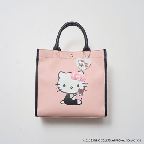 チョコレートを持った「ハローキティ」が大きくプリントされたミドルサイズのトートバッグです。なめらかな合成皮革素材に立体的なエナメル仕様のリボンがあしらわれています。マチ幅を広く取っているため、見た目以上に大容量です。
