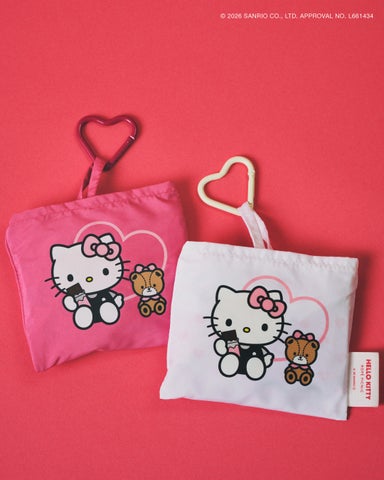 コンパクトに折りたためるエコバッグです。チョコレートを持った「ハローキティ」やお友だちの「タイニーチャム」がプリントされ、畳んでも可愛らしいデザインです。ハートのカラビナ付きで、バッグに付けて携帯することも可能です。