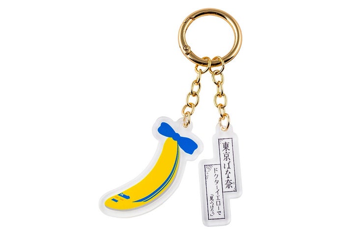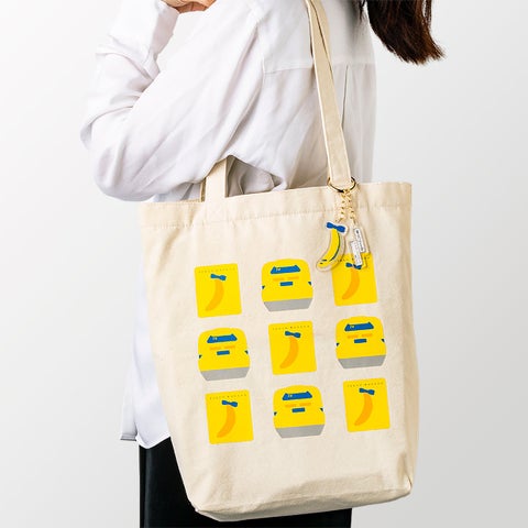 トートバッグには、人気のコラボロゴデザインをアクリルキーホルダーにしたものが付属します。「東京ばな奈?ドクターイエロー?」と問いかけるようなデザインのアクリルキーホルダーが、本商品のアクセントとなります。