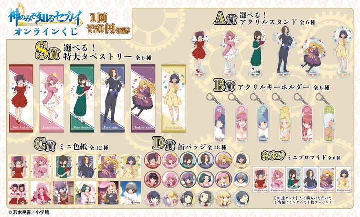 「『神のみぞ知るセカイ』オンラインくじ」では、以下の賞品が用意されています。各賞全種のうち、いずれか1つが当たります。