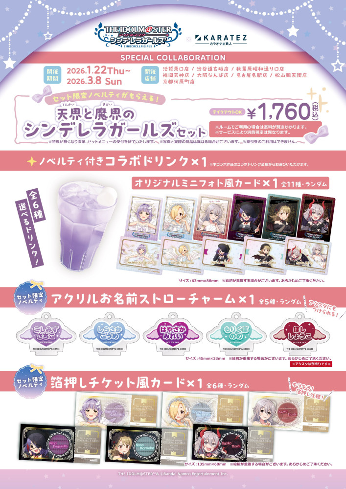 アイドルたちをイメージした6種のコラボドリンクを提供します。1杯ご注文ごとにミニフォト風カード(全11種・ランダム)をおひとつプレゼント。さらに、限定特典付きの「天界と魔界のシンデレラガールズセット」も登場。このセットには、選べるコラボドリンクとミニフォト風カードに加え、セットメニュー限定のアクリルお名前ストローチャーム(全5種・ランダム)や、きらきら箔押しチケット風カード(全6種・ランダム)が特典として付属します。