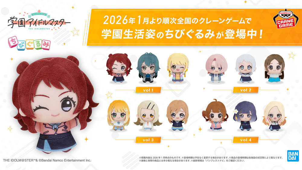 学園アイドルマスターの「ちびぐるみ~学園生活~」が、2026年1月より全国のクレーンゲームに順次登場しています。全12種のアイドルたちが制服や私服姿でラインナップ。