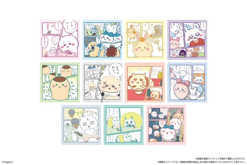 商品には約50mm×約50mmの正方形シールが1枚付属します。このシールは、漫画のコマを活かした全11種類のオリジナルデザインです。ワッフルのプリントとシールの絵柄の組み合わせはランダムです。
