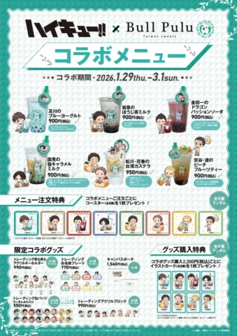 人気アニメ「ハイキュー!!」とタピオカドリンクの「Bull Pulu」が2026年1月29日よりコラボキャンペーンを開催します。限定メニュー、描きおこしグッズ、店内装飾が登場します。