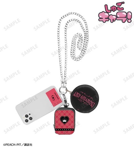 日奈森 あむのモチーフをデザインに落とし込んだ3連ショルダーポーチです。ショルダーストラップにフォンタブ、ミニポーチ、コインケースがセットになっています。コインケースは日奈森 あむの名前やヘアゴムのバツマークを使用しハート型を表現しました。ミニポーチはしゅごたまポーチ風、フォンタブは「UNLOCK MY HEART.」のイメージマークをデザインしています。ネックホルダーや斜め掛けショルダーとしても使用でき、イベントや旅行から日常使いまで幅広いシーンで活躍します。