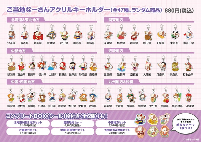 ご当地なーさんアクリルキーホルダーは、以下のコンプリートBOXでも販売します。各セットにはダイカットシールが付属します。