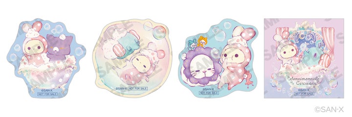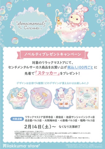 • ノベルティ② ステッカー: センチメンタルサーカス商品お買い上げ税込1,100円ごとに先着でプレゼントします。リラックマストア限定デザインのホログラム加工ステッカー(全4種)で、デザインは選べません。1会計につき4点までのプレゼントとなり、税込4,400円のお買い上げで全4種類をプレゼントします。
