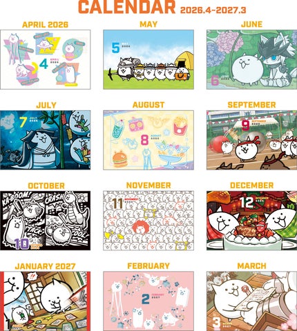 本カレンダーは2026年4月から2027年3月までの期間に対応しています。ゲームでおなじみのにゃんこたちが、「かわいい」から「かっこいい」まで、これまでにないほど多彩なテイストのイラストで描かれています。季節感あふれるバリエーション豊かなにゃんこたちを毎月楽しむことができる一方、予定を書き込みやすい実用的なデザイン設計です。めくるのが楽しみになる、見応えのある仕上がりです。