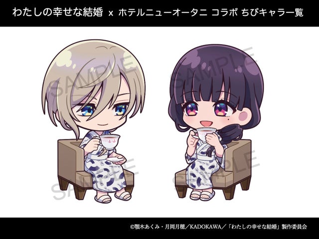 本プランのために描き下ろされた、ホテルの制服を着用した斎森美世と久堂清霞の二人が、宿泊者をお出迎えします。また、実際のお部屋にある浴衣と同じデザインの浴衣を着たちびキャラたちと、一緒におくつろぎいただけます。