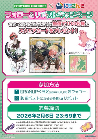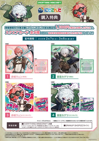 株式会社GRANUPは、EVERYTHING MINECRAFTの一部店舗とGRANUP SHOPにて、2月7日より「にじさんじ」所属ライバー「赤城ウェン」「叢雲カゲツ」とのコラボキャンペーンを開催します。撮り下ろしビジュアルを使用した新商品発売に加え、購入特典やスタンディパネルの展示も実施します。