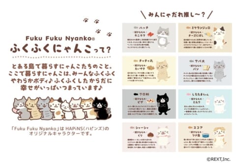 「Fuku Fuku Nyanko」は、インテリア・生活雑貨専門店HAPiNS(ハピンズ)のオリジナルキャラクターです。ふくふく島で暮らす8匹の“にゃんこ”たちで構成され、やわらかい絵のタッチが特徴です。2025年に誕生10周年を迎えました。