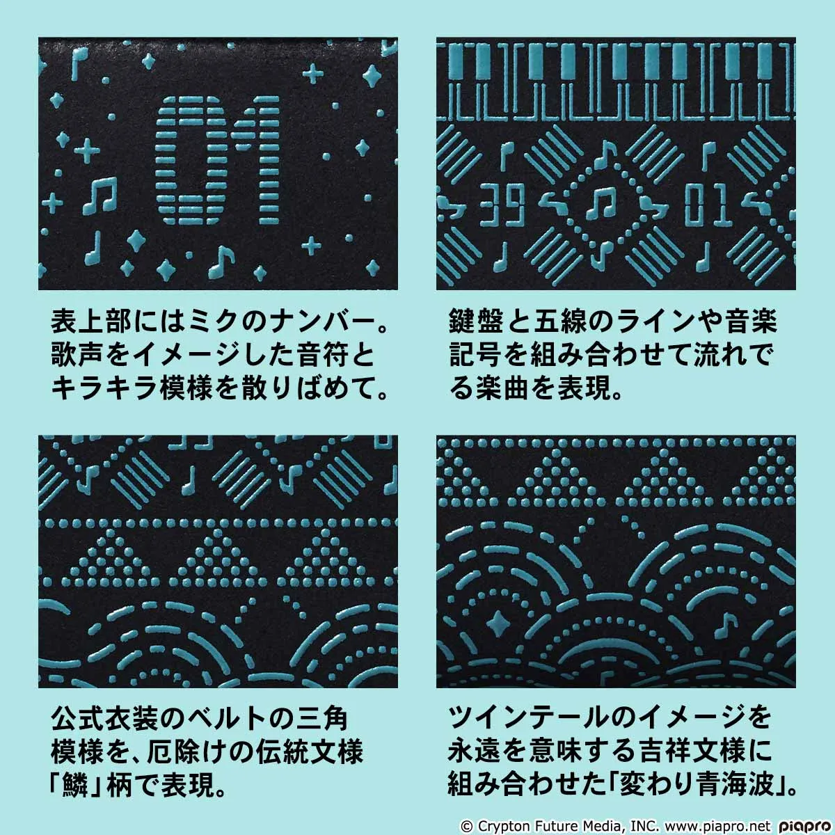 • デザイン: ミクのツインテールのイメージと永遠を意味する吉祥文様を組み合わせた「変わり青海波」の伝統文様を採用し、ミクへの変わらない想いを込めています。