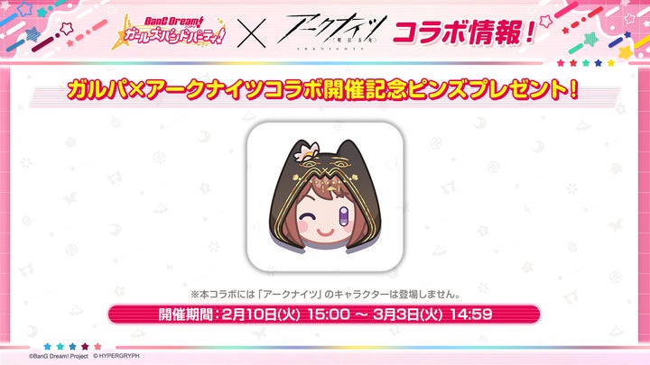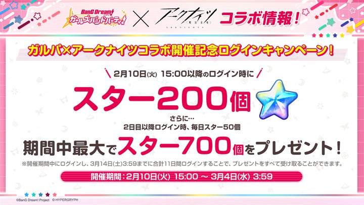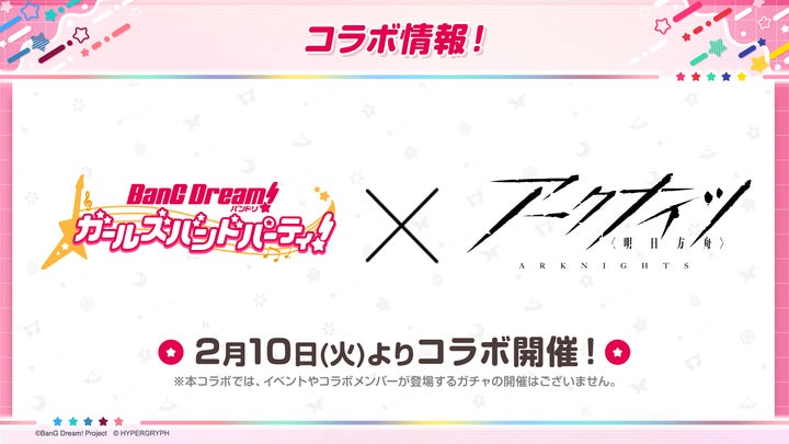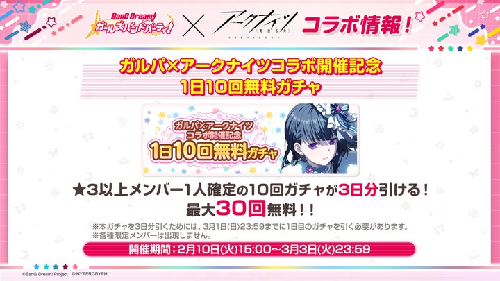 2026年2月10日(火)15時から2026年3月3日(火)23時59分までの間、「ガルパ×アークナイツコラボ開催記念1日10回無料ガチャ」を開催します。最大3日分引くことができ、合計30回ガチャを引けます。最大回数を引くには、2026年3月1日(日)23時59分までにログインし、最初の1日分を利用する必要があります。