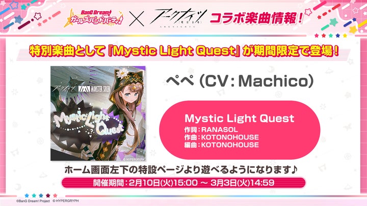 コラボ開催を記念して、アークナイツのEP曲『Mystic Light Quest』の原曲が2026年2月10日(火)15時より期間限定で登場します。2026年3月3日(火)14時59分まで、ガルパ内のホーム画面左下のバナーからライブブーストを消費せずにプレイ可能です。